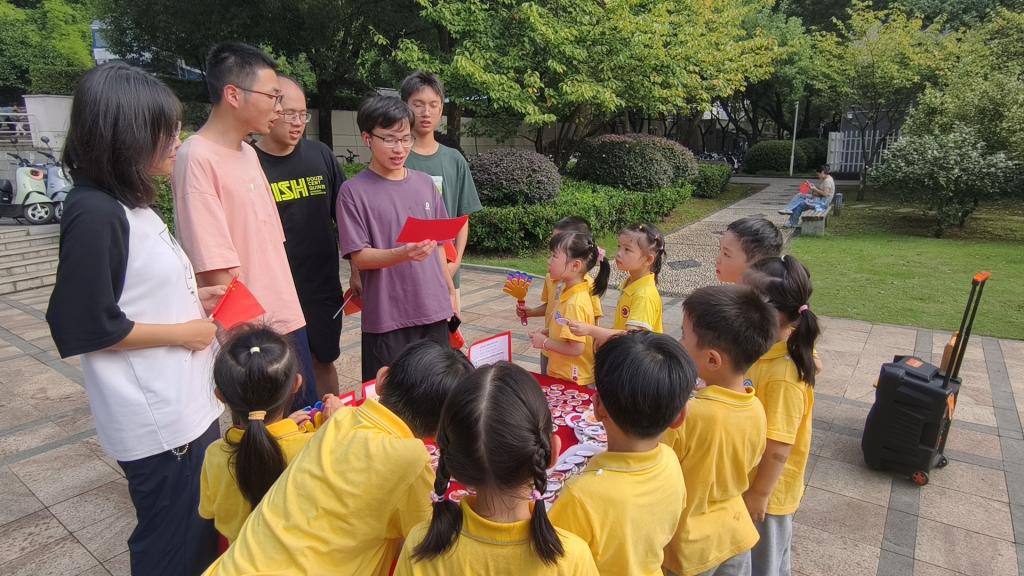 9月28日,30余名大班幼儿走进铁路园,和交通运输工程学院的大学生们一起为祖国庆生。孩子们作为“小小发起者”,“带领”哥哥姐姐完成红歌传唱、温暖留言、红色知识问答等互动项目,并为他们佩戴上特制的纪念徽章或红色手串。这一互动不仅是任务的完成,更是一场荣誉的授予,象征着红色基因在两代人之间的传递与共鸣,让爱国的种子在童心中生根,让文化传承在青春接力中焕发新生。